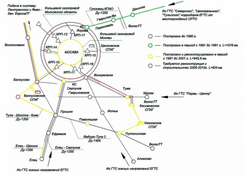 Годовой объем газа, который необходим разнообразным отраслям экономики Московского региона, составляет порядка 44-46 млрд. кубических метров. Это десятая часть всего добываемого «Газпромом» природного газа. Для обеспечения поставок газа в таких объемах в 1960-е – 1970-е годы была построена уникальная система кольцевого газопровода Московской области. В данный газопровод газ поступает с южного и северо-восточного направлений. Затем, через систему контрольно-распределительных пунктов, газ распределяется по конечным потребителям. В 2010 году был осуществлен масштабный ремонт по замене изоляционного покрытия кольцевого газопровода Московской области.