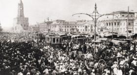 Фотографии Москвы 1920-х годов — Москва еще не перестроенная, вся в узких улочках и трамвайных путях, где по всей ширине проезжей части кучкуются извозчики, а прохожие шастают, натыкаясь друг на друга.